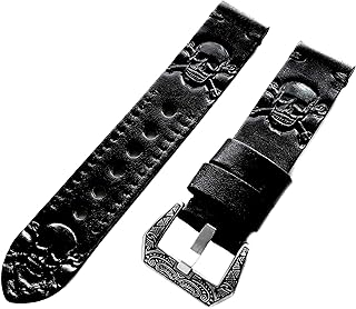 NICKSTON Embossed Skull X Bones Genuine Leather Band Compatible with Apple 38mm 40mm 42mm 44mm Watch SE 6 5 4 3 2 1 All Series Black Strap (44mm Watch Case Size, 1. Engraved Silver Color Buckle)