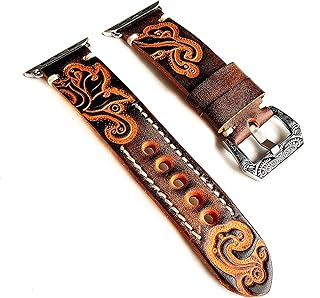 Embossed Tooled Brown and Orange Genuine Leather Luxury Band Strap Compatible with Apple Watch 38mm 40mm 42mm 44mm iWatch 1 2 3 4 Series (38mm Watch Case Size, 1. Engraved Silver Color Buckle)