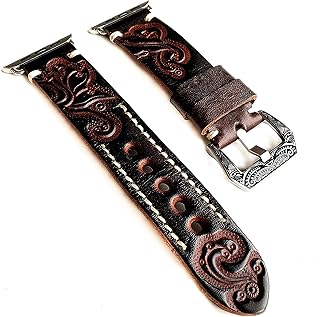 Embossed Tooled Dark Brown Genuine Leather Luxury Band Strap Compatible with Apple Watch 38mm 40mm 42mm 44mm iWatch 1 2 3 4 Series (44mm Watch Case Size, 1. Engraved Silver Color Buckle)
