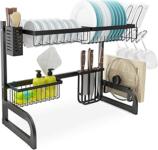 シンク上ディッシュ乾燥ラック 調節可能 2段 大型 ディッシュドライヤーラック キッチンオーガナイザー ストレージ スペースセーバー シェルフ用品ホルダー テーブルウェア水切り器 (24.5インチ - 31.5インチ ブラック)