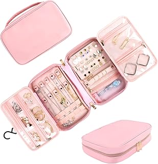 Matein トラベルジュエリーオーガナイザー ポータブルハンギングレザーキャリーストレージバッグ 大きな防水ジュエリーポーチ フック付き ネックレス/イヤリング/リング用ジュエリーケースホルダー 女性へのギフトに ピンク