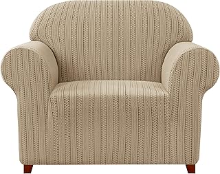 Subrtex 一体型 ソファーカバー 1人掛け 肘付き ジャカード 縞柄 伸縮素材 ぴったりフィット式 柔らかい ソファカバー(1人掛け、カーキ 縞柄)