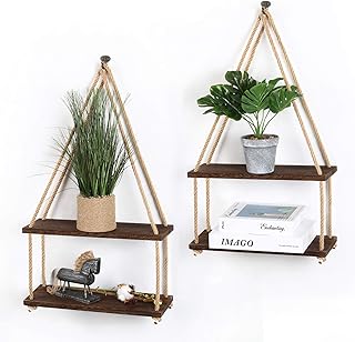 LIANTRAL 吊り下げ棚 2段 フローティング壁棚 吊り下げロープ 植物棚 寝室 リビングルーム 2点セット