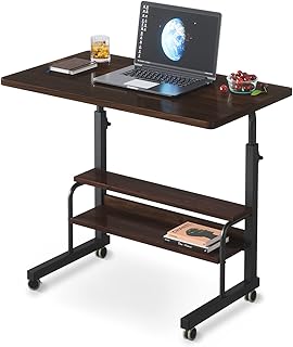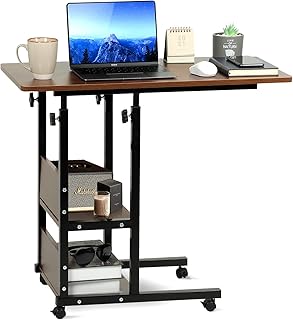 HANYEEサイドテーブル キャスター付き 2段収納棚付き 高さ調節 コの字 昇降式テーブル パソコンデスク 勉強机 仕事デスク 介護用テーブル ベッドサイドテーブル ソファーサイドテーブル 幅80cm×奥行40cm×高さ65~90cm 組立簡単 日本語説明書付き(ウォルナット)